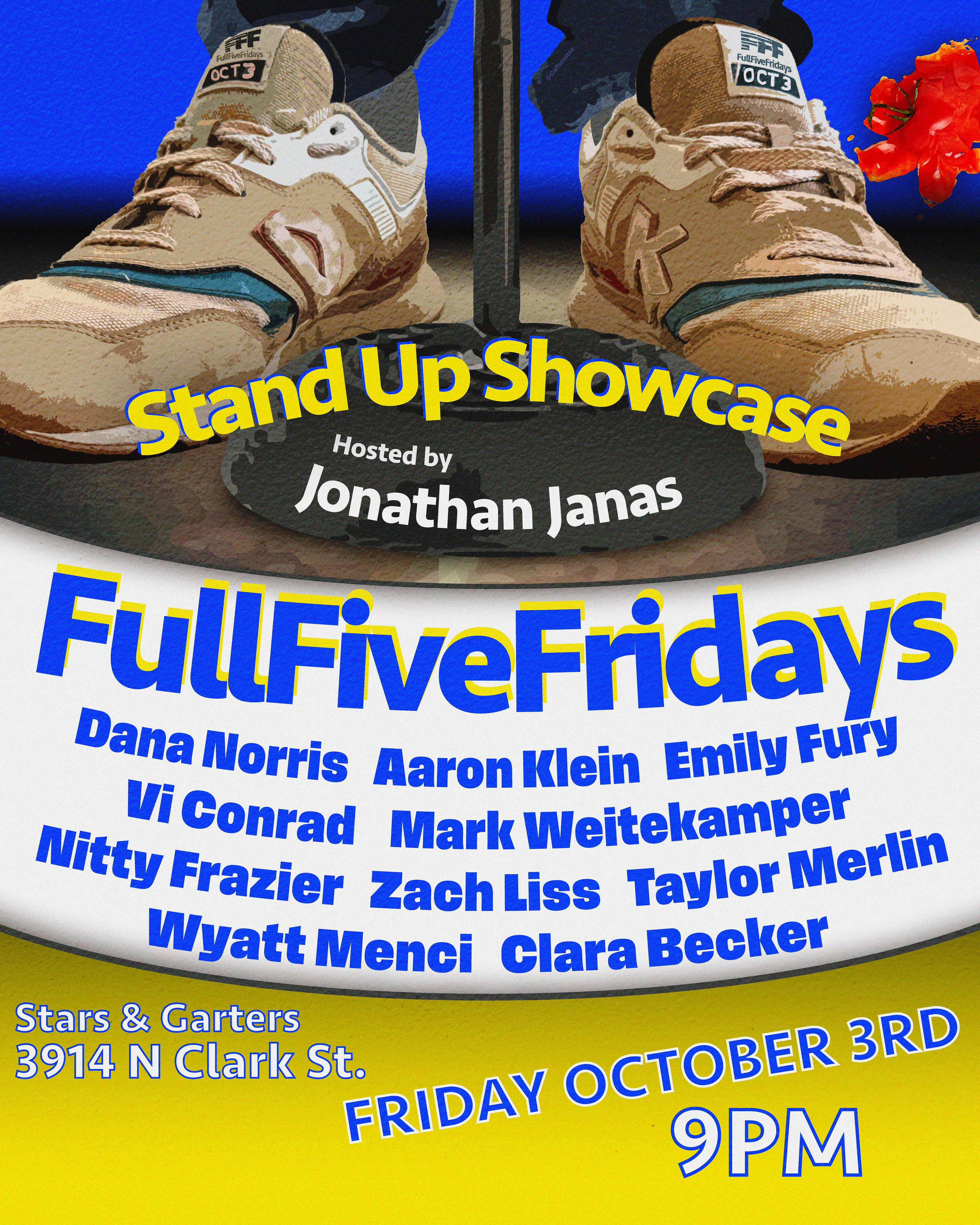 The Full Five Fridays stand-up showcase is a multi-city production that began its Chicago run in September 2025. They look to support up-and-coming comedians with 5 minute, recorded sets, on a monthly basis. They also provide weekly open mic opportunities to let comedians workshop their material leading up to the showcase.